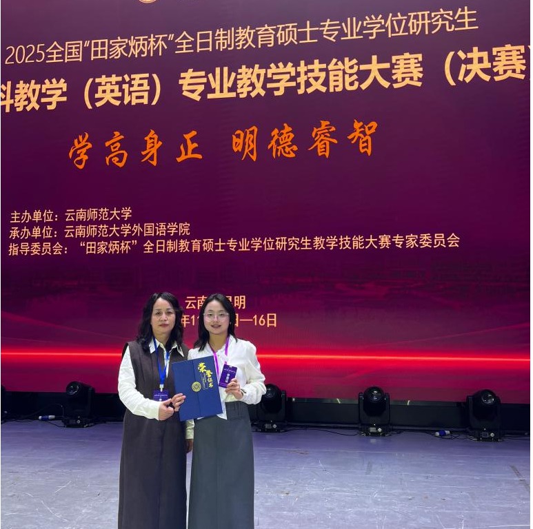 11月14-16日,2025年全国“田家炳杯”全日制教育硕士学科教学(英语)专业教学技能大赛决赛在云南师范大学举办。经多轮角逐,我校伟德betvlctor1949源于英国2024级研究生张攀静凭借扎实功底、精巧设计与出色临场表现荣获二等奖,伟德betvlctor1949源于英国教师郭晓英教授荣获“优秀指导教师”奖。