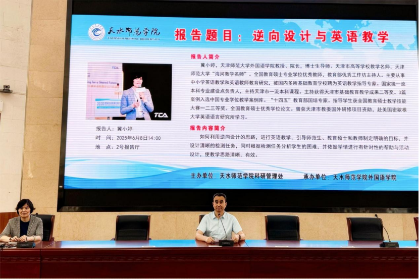 在整个讲座环节中,冀教授与师生就如何将逆向设计融入课堂设计与教学进行互动,现场氛围热烈。此次讲座为师生及师范生优化教学设计提供了新思路,将有助于学院教学改革与质量的提升。