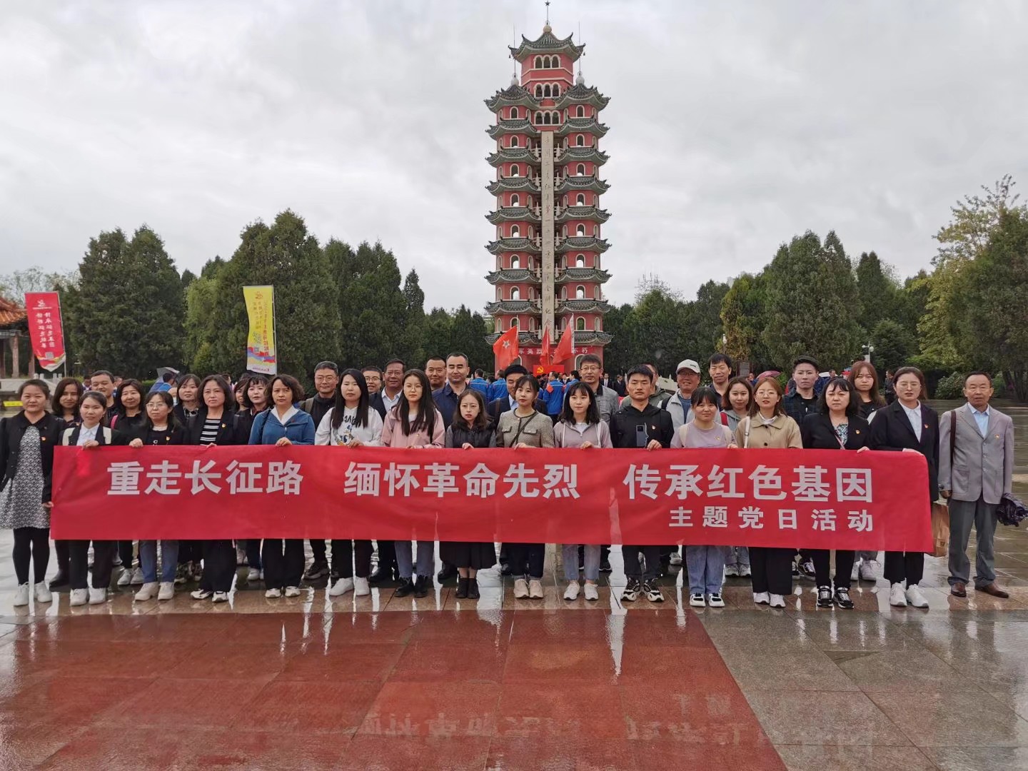 首先,全体师生党员肃立在广场会师纪念塔下,举行了“重走长征路,缅怀革命先烈,传承红色基因”的主题党日活动。在淅淅沥沥的雨中,党员们向红军英烈敬献花篮、鞠躬致敬、重温入党誓词,在整齐洪亮的宣誓声中,党员们重新感受了那份庄重的承诺、那份厚重的责任。